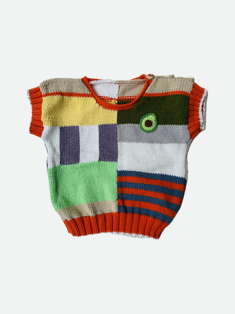Soft, snuggly, and oozing with cuteness! This hand-knit body warmer by Fresh Threads features a dreamy mix of colours and a proud avo. Easy button details on the shoulder make dressing fuss-free — because we know parents need that!