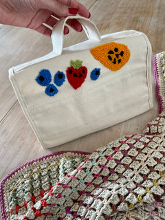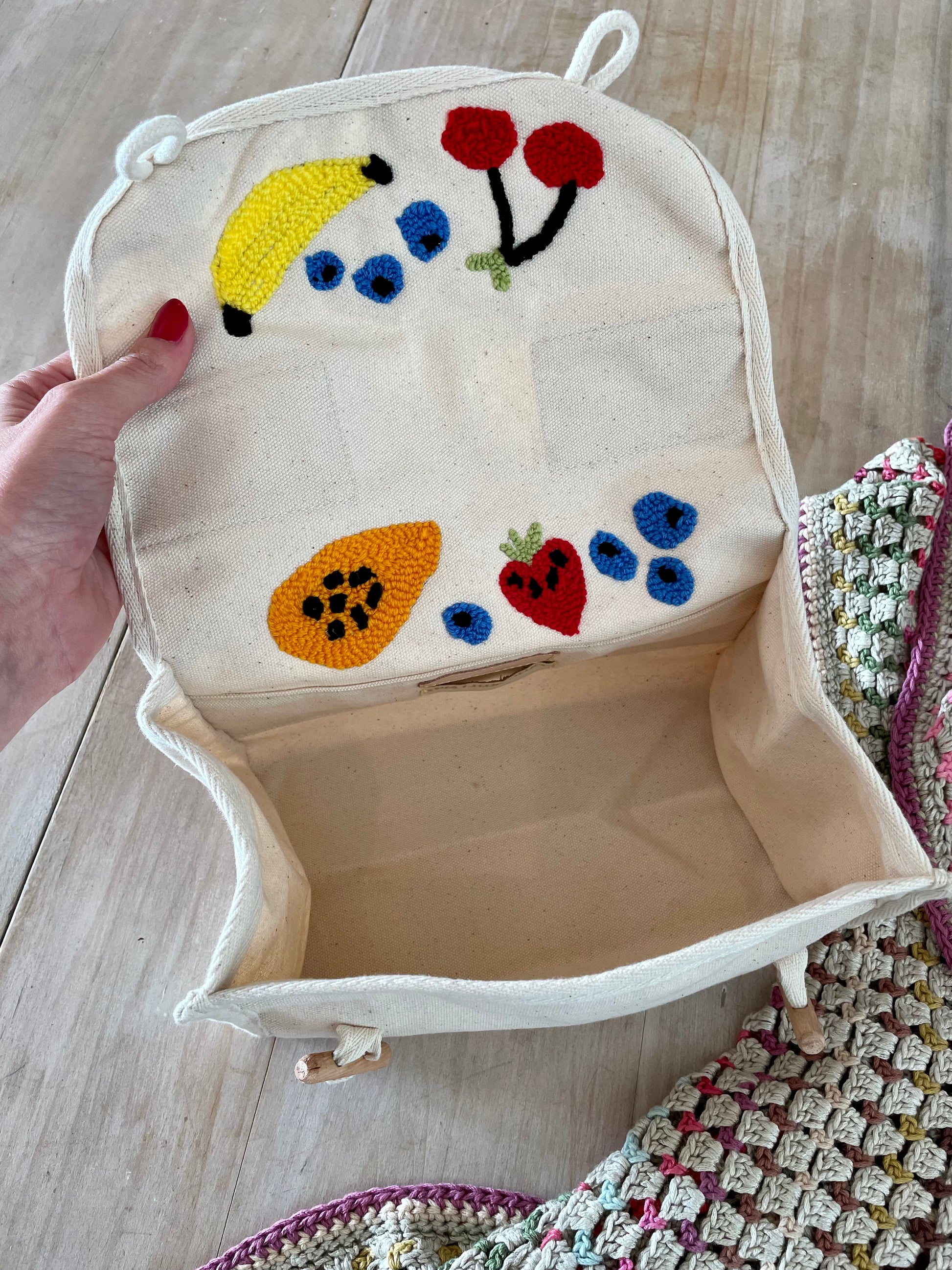 Embroidered with a selection of fun fruits. 4-6 week lead time.