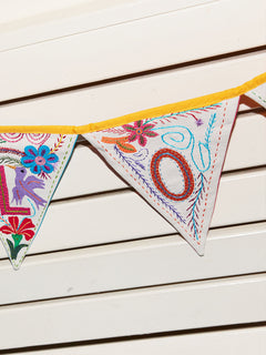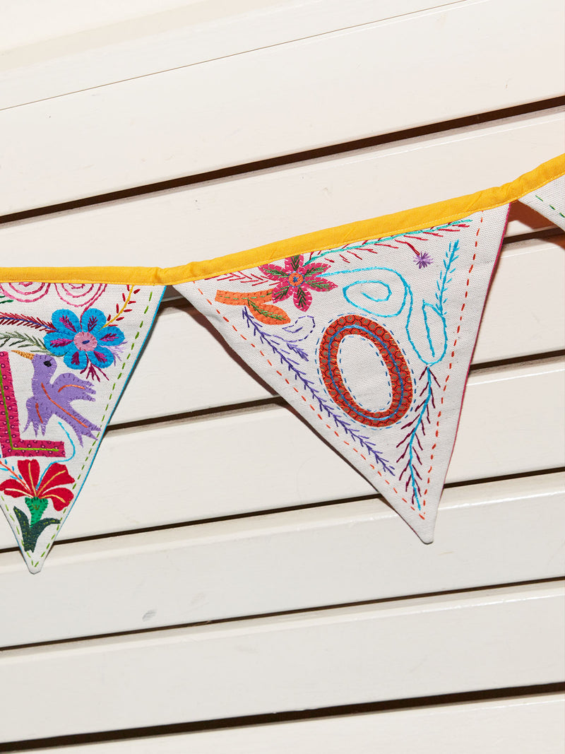 One-of-a-kind, hand-embroidered bunting, made to order with exquisite craftsmanship. The letters are fully interchangeable, easily threaded onto the bunting string for versatility. Pricing reflects the full alphabet (26 letters) or your choice of letters and images. Truly too exquisite to miss!
